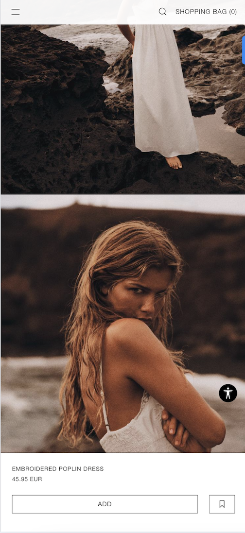 I appreciate that Zara has “Quick Add” functionality on their collection pages - including on mobile view! - but the UX is (also) a bit chaotic. First of all, the plus signs to indicate this option are tiny and a bit hard to see. Then, the pop-up that opens is super cluttered - with additional product images, links to a size guide, and more - which kind of detracts from the “Quick” appeal: